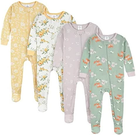 Make your bedtime routine just a little sweeter with our 4-pack snug fit footed cotton pajamas. Each pair of baby pajamas are made with soft cotton, a comfortable and breathable fabric that’s perfect to slumber in. Our pajamas are made with a snug fit to ensure a safe night’s sleep. These baby and toddler pajamas are perfect to accommodate cool weather, as the footed legs add extra warmth to keep your little one’s toes warm the whole night through. The snug fit footed cotton pajamas feature front zippers, so changes are easier than ever. The zippers have safety tabs at the top to prevent baby from being poked. Give these PJ’s as a thoughtful and practical gift. Kids will love the fun patterns and designs and parents will love how easy they are to care for. Each piece in this set is machine washable and machine dryable. This set includes four pajamas.