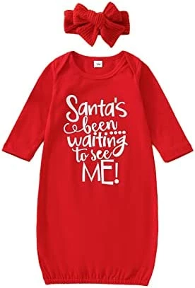 - Baby Girl Christmas Letter Gowns With Headband: cute and soft sleep romper, long sleeve, Santa’s Been waiting to see ME letter printed, self-tie headband, newborn girl sack pajamas, give your baby a comfortable sleep