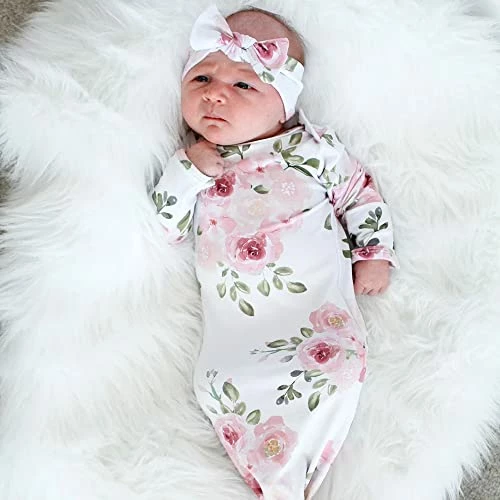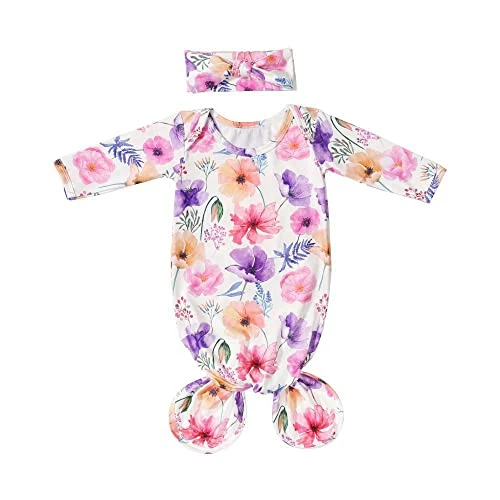 8 reviews for Coupon โค๏ธ Mikccer Baby Newborn Knotted Gown 0-6 Months, Soft Breathable Sleeper Gowns, Babies Girl Coming Home Outfit Infant Watercolor Flowers Nightgowns With Headband Set ๐