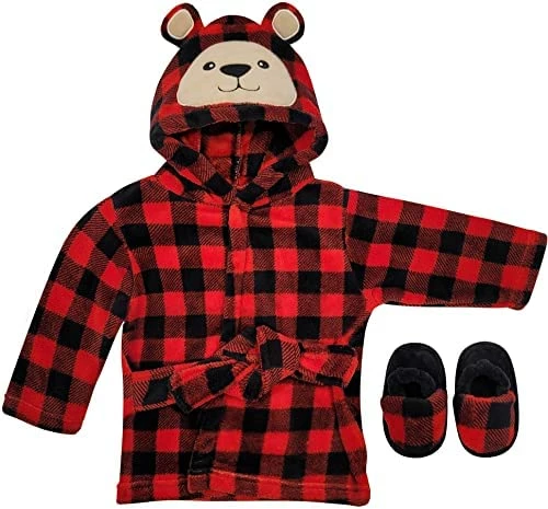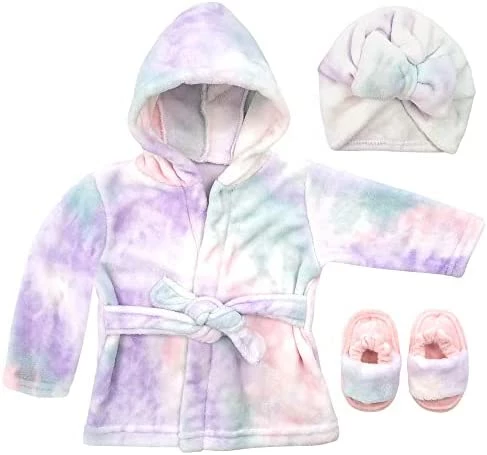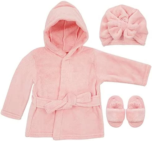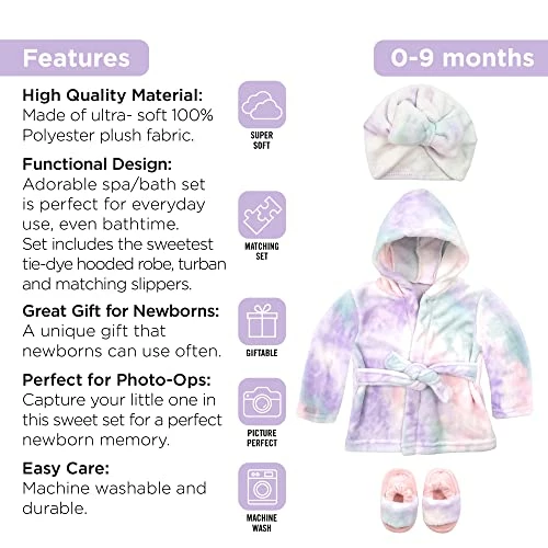- Baby Robe Set: A cozy baby is a happy baby. This hooded bathrobe with self-tie belt and adorable matching set of slippers and Turban (Girls Styles Only) is a great choice to soothe your baby once bath time fun is over before a good night’s sleep.