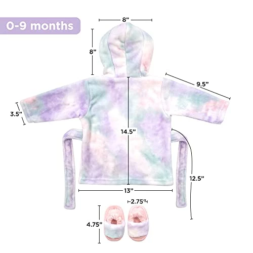 - Size and Other Details: The Tie Dye bathrobe measures 14.5 inches long from shoulders to hem. This set is designed for babies 0-9 months and is not only machine-washable (Gentle – Cold) but also dryer-safe (low), so you can use as a baby beach towel.