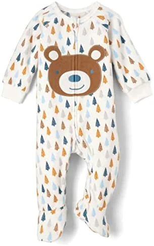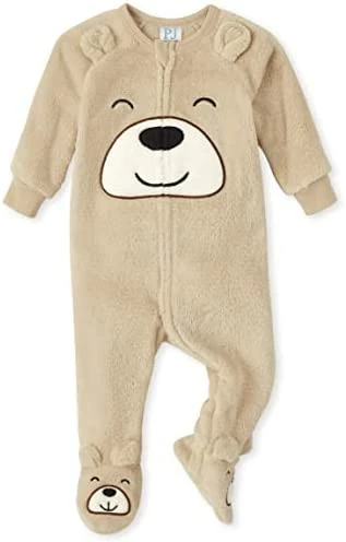- DESIGN β Features long sleeves, rib-knit crew neck and sleeve cuffs, attached footies with bear face and elasticized back ankles and bear face graphic design at front