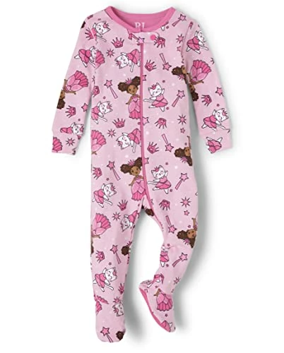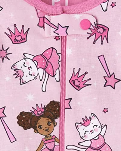 - DESIGN — Features long sleeves, rib-knit crew neck and sleeve cuffs, attached footies with elasticized back ankles and allover princess and cat print